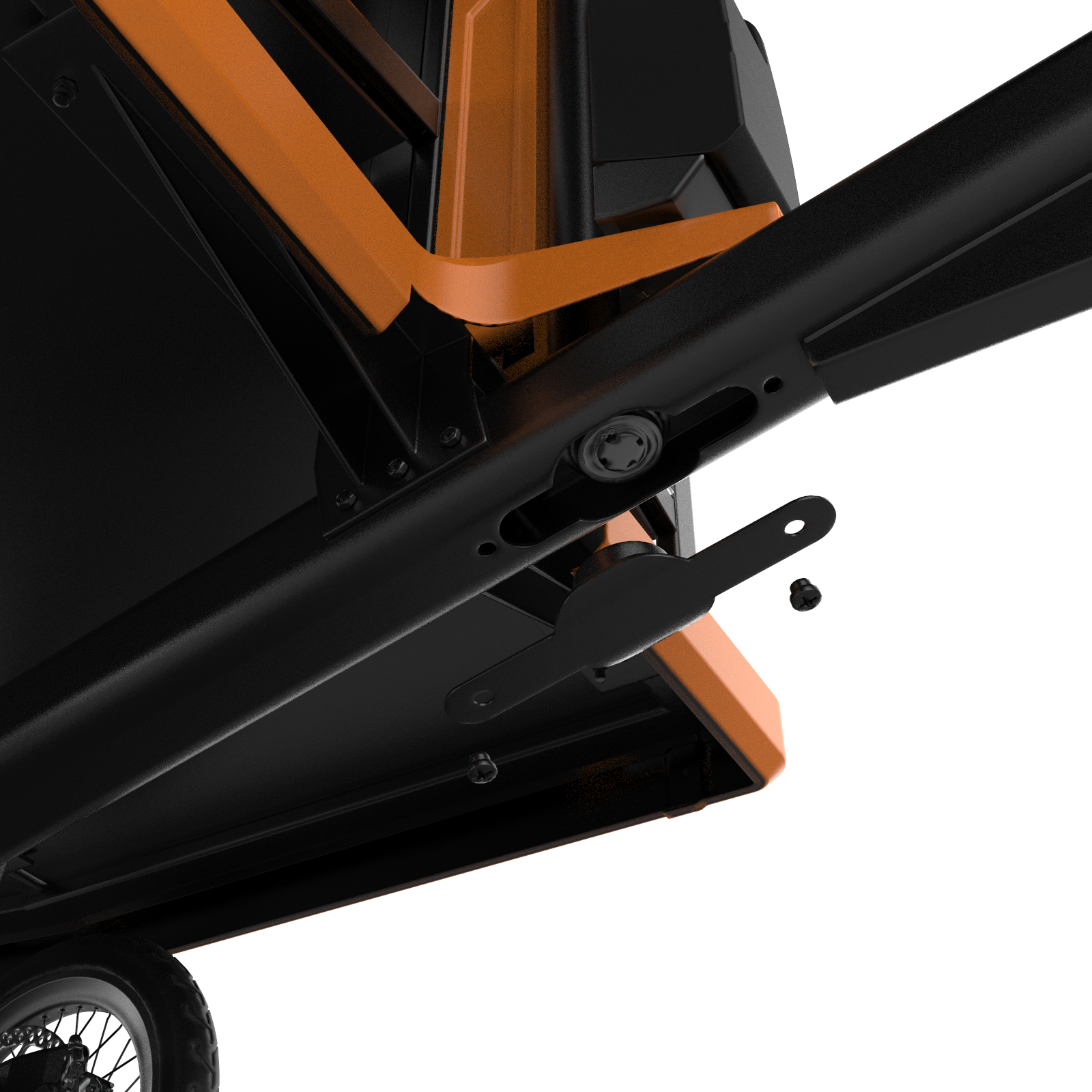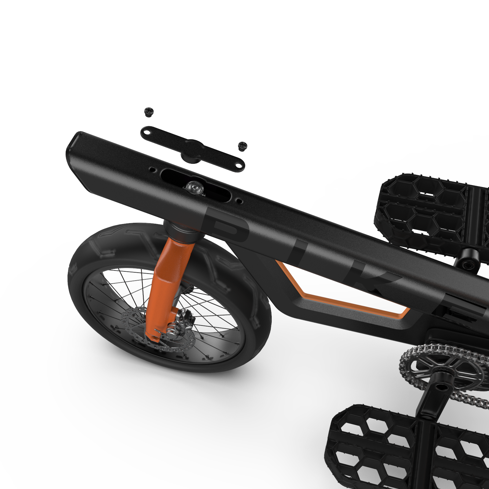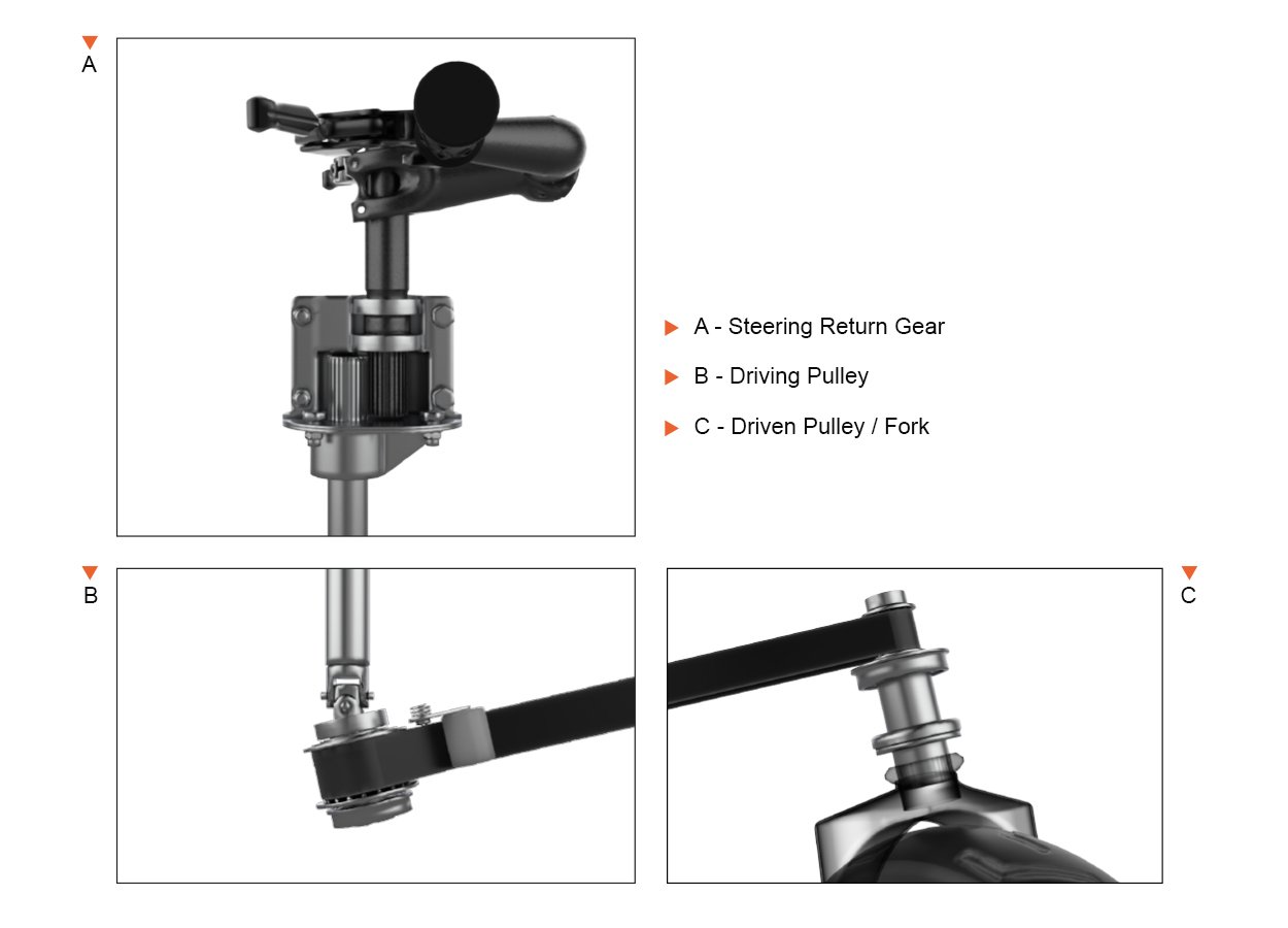 Inspired by vehicles designed for maneuverability in similar environments, the decision was made to implement rear-wheel steering on Pike for optimal control. To ensure proper functionality, the system includes a mechanism positioned at the top, which reverses the steering actions to the rear wheel. This setup operates through a drive pulley connected to a driven pulley on the rear wheel fork, with a 1:1.5 ratio to enhance the steering angle. This innovative feature significantly improves handling and adaptability in tight, dynamic spaces.