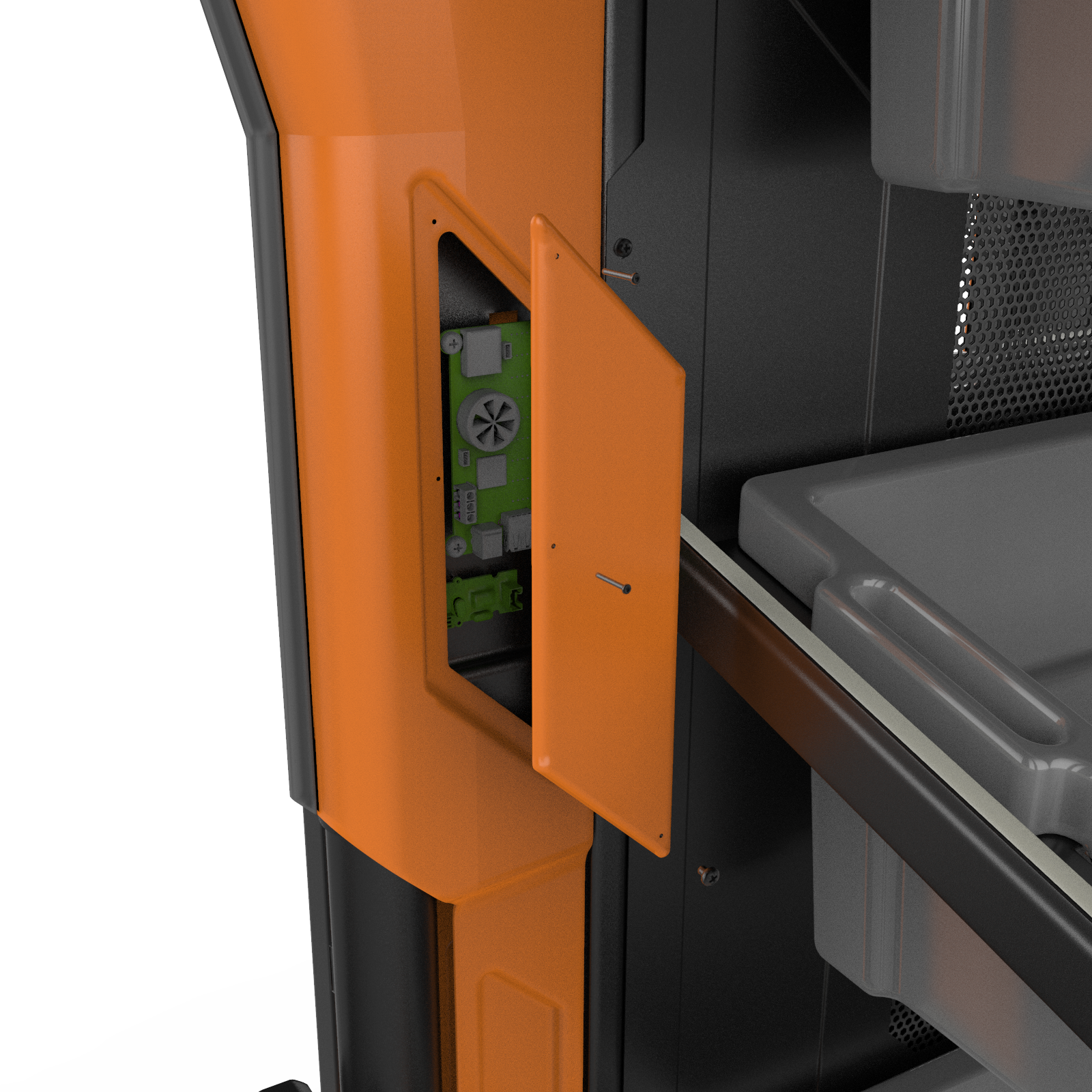 The frame is mainly steel and aluminum, with welded joints in the steel sections and bolted connections elsewhere for stability. The outer shells are injection-molded ABS, while the sorting boxes are made of injection-molded HDPE for durability.