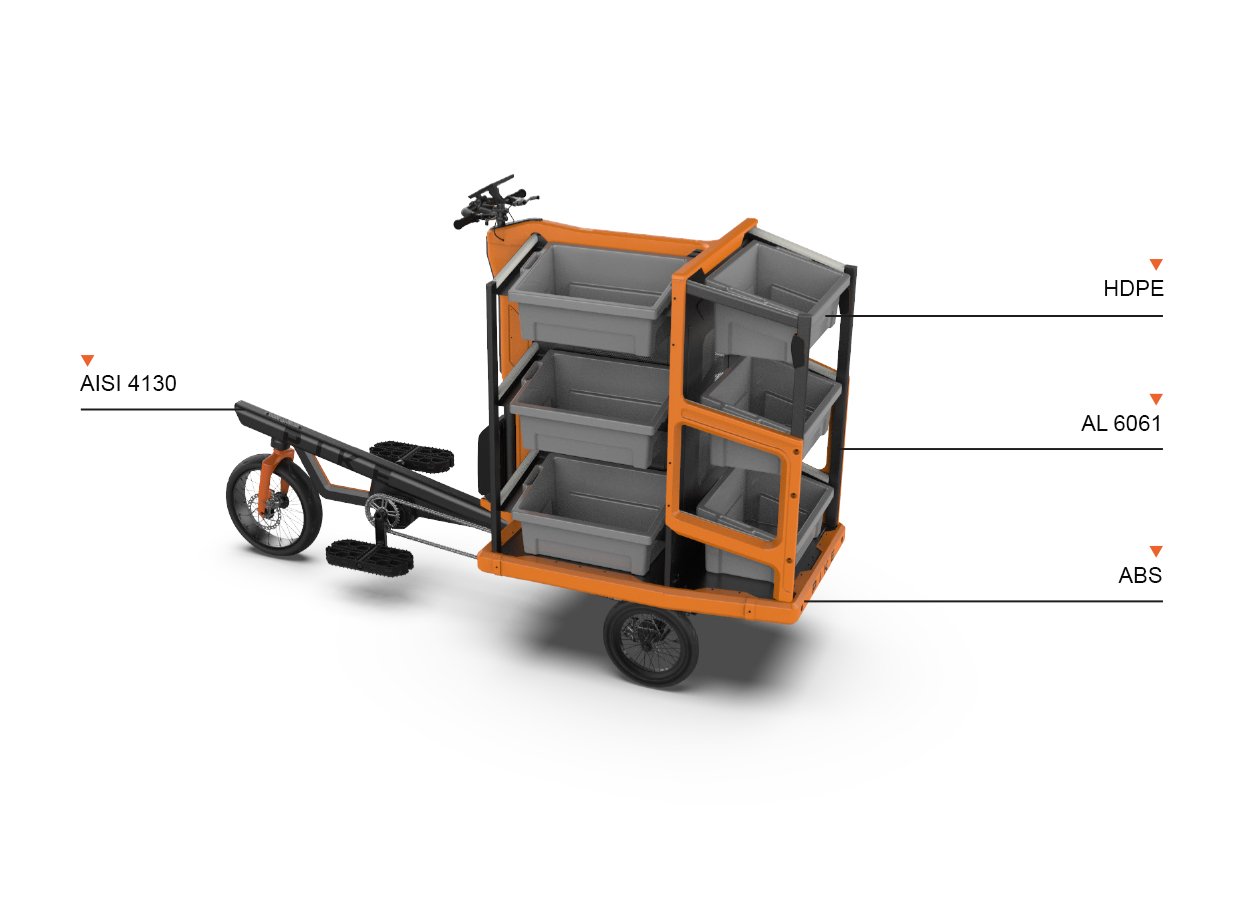 The choice of standing cycling was driven by the specific needs of warehouse pickers, who often make short, fragmented movements to retrieve packages. This design eliminates the need for frequent mounting and dismounting, as the absence of a seat allows for quick transitions. The flat, even surfaces typical of warehouse environments make standing cycling a natural fit, providing better visibility for the operator. To improve comfort and optimize cycling efficiency, specialized pedals were selected to offer enhanced control and support for the user’s movements.